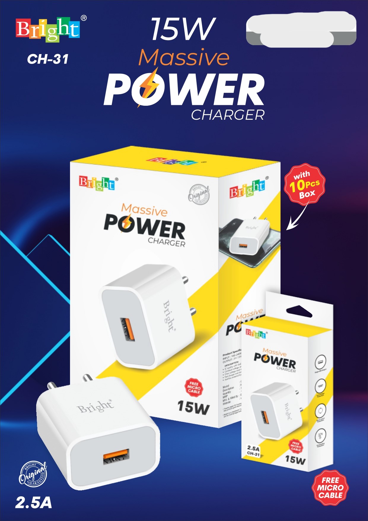 Experience ultra-fast charging with the 15W Massive Power Charger, delivering 2.5Amp output for quick and efficient power. Comes with a free micro USB cable for added convenience.