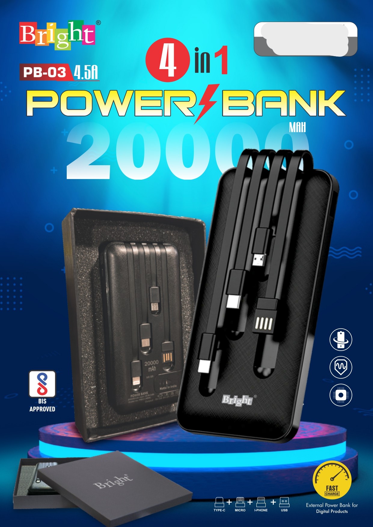 The 4-in-1 Power Bank 20000mAh offers four input charging options (Type-C, iPhone, Micro-USB, USB), supports up to 24W fast charging, and delivers a 4.5A output for all your digital devices.